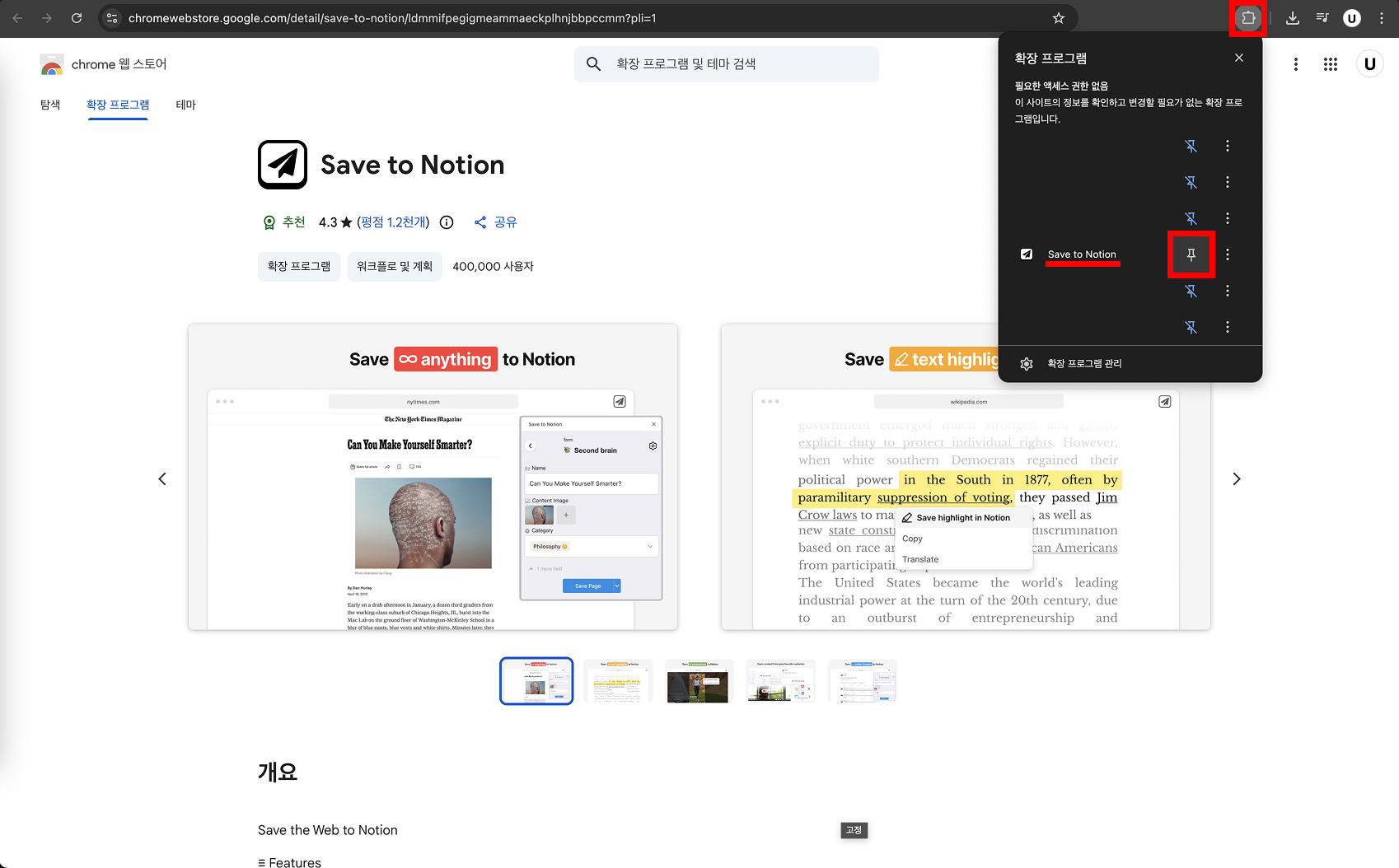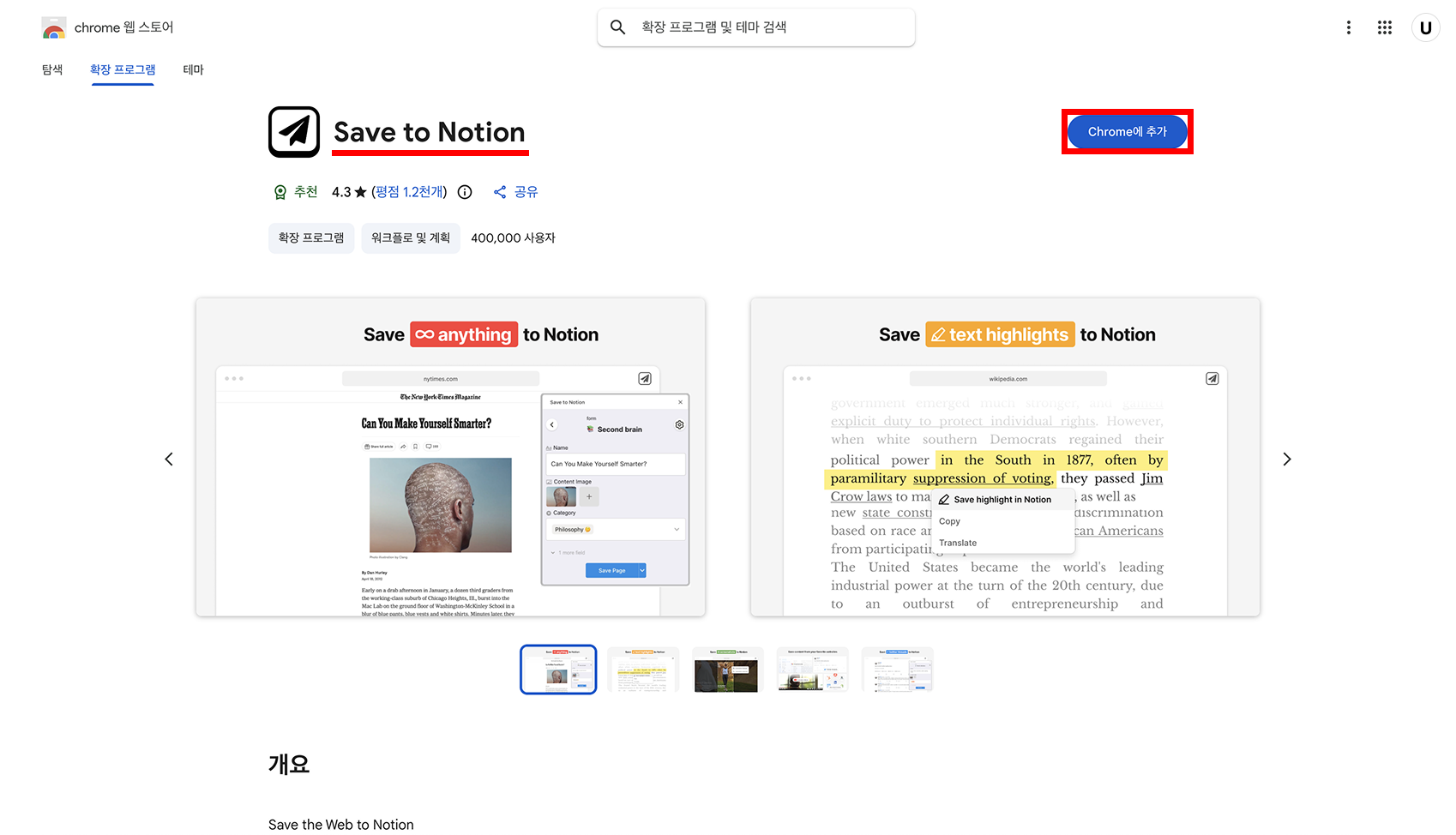 Chrome ์น ์คํ ์ด์์ โSave To Notionโ ํ์ฅ ํ๋ก๊ทธ๋จ์ ์ค์นํฉ๋๋ค.