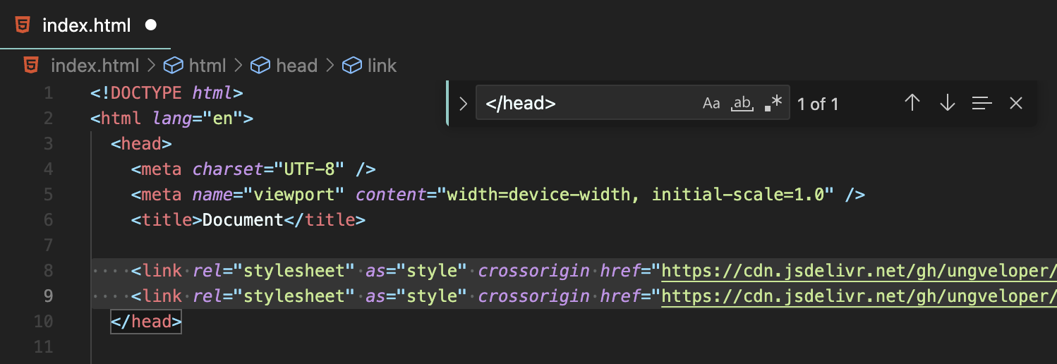 ์์ ์ค์ธ ์ฝ๋์์ "์ฐพ๊ธฐ(ctrl+f)"๋ฅผ ๋๋ฌ "</head>"๋ฅผ ๊ฒ์ํ์ฌ ์ฝ๋์ ์์น๋ฅผ ํ์ธํ๋ค.