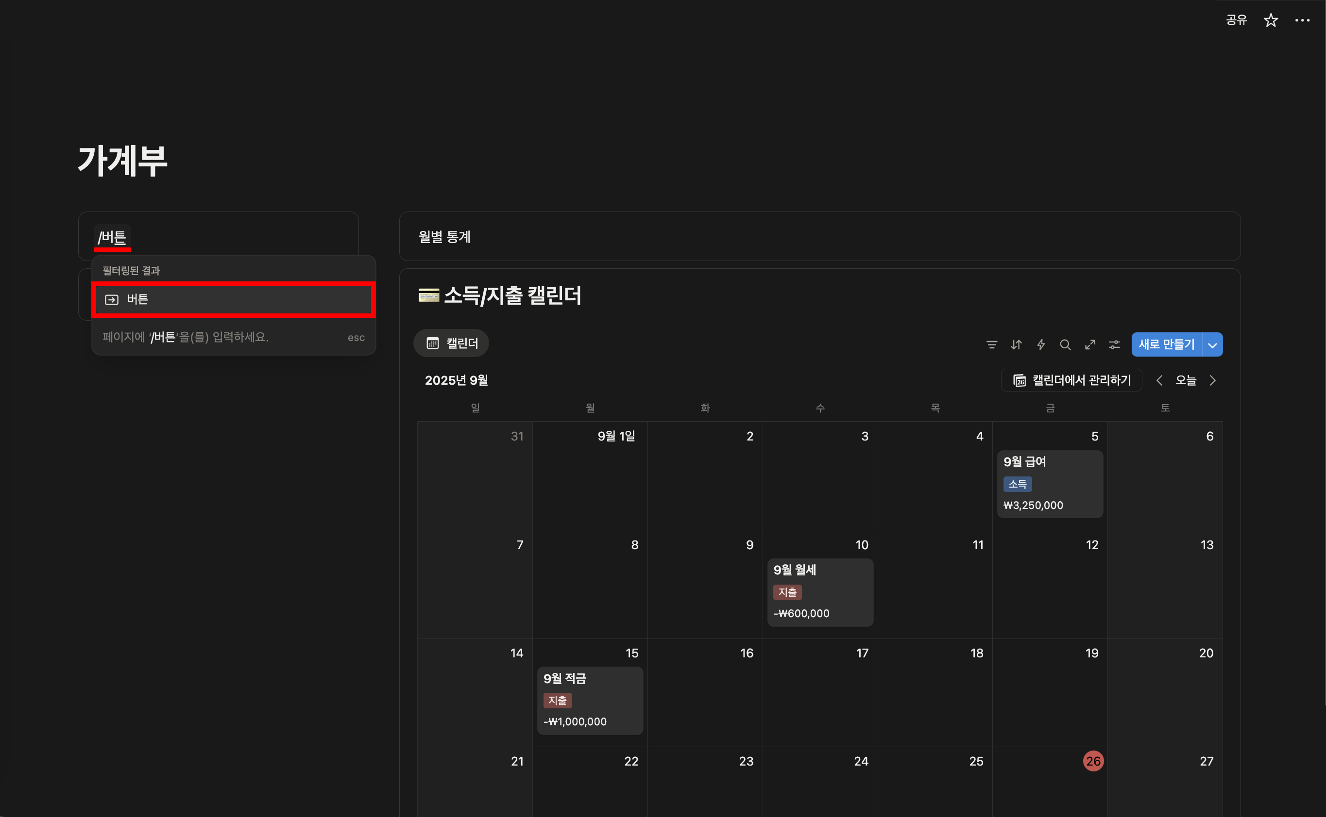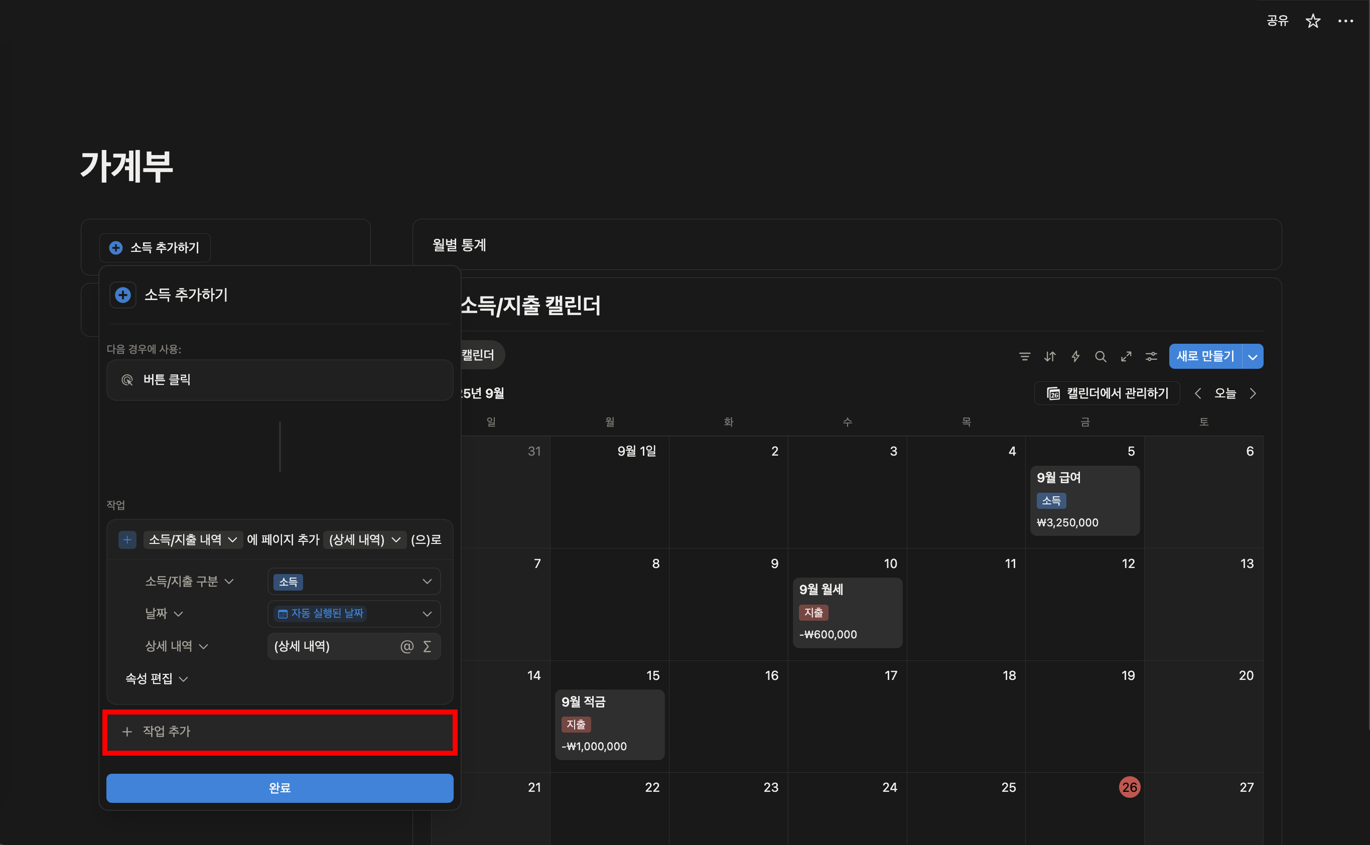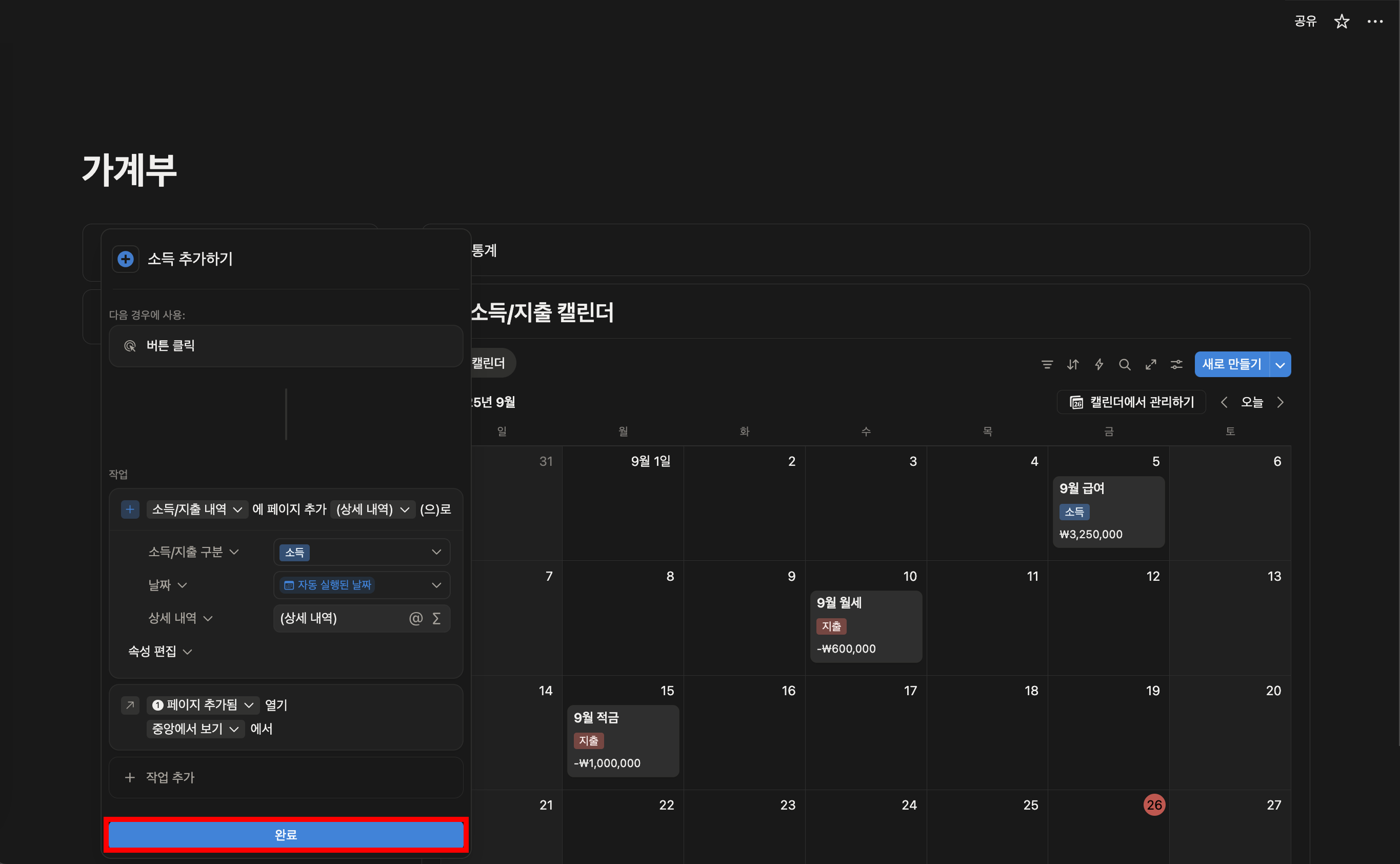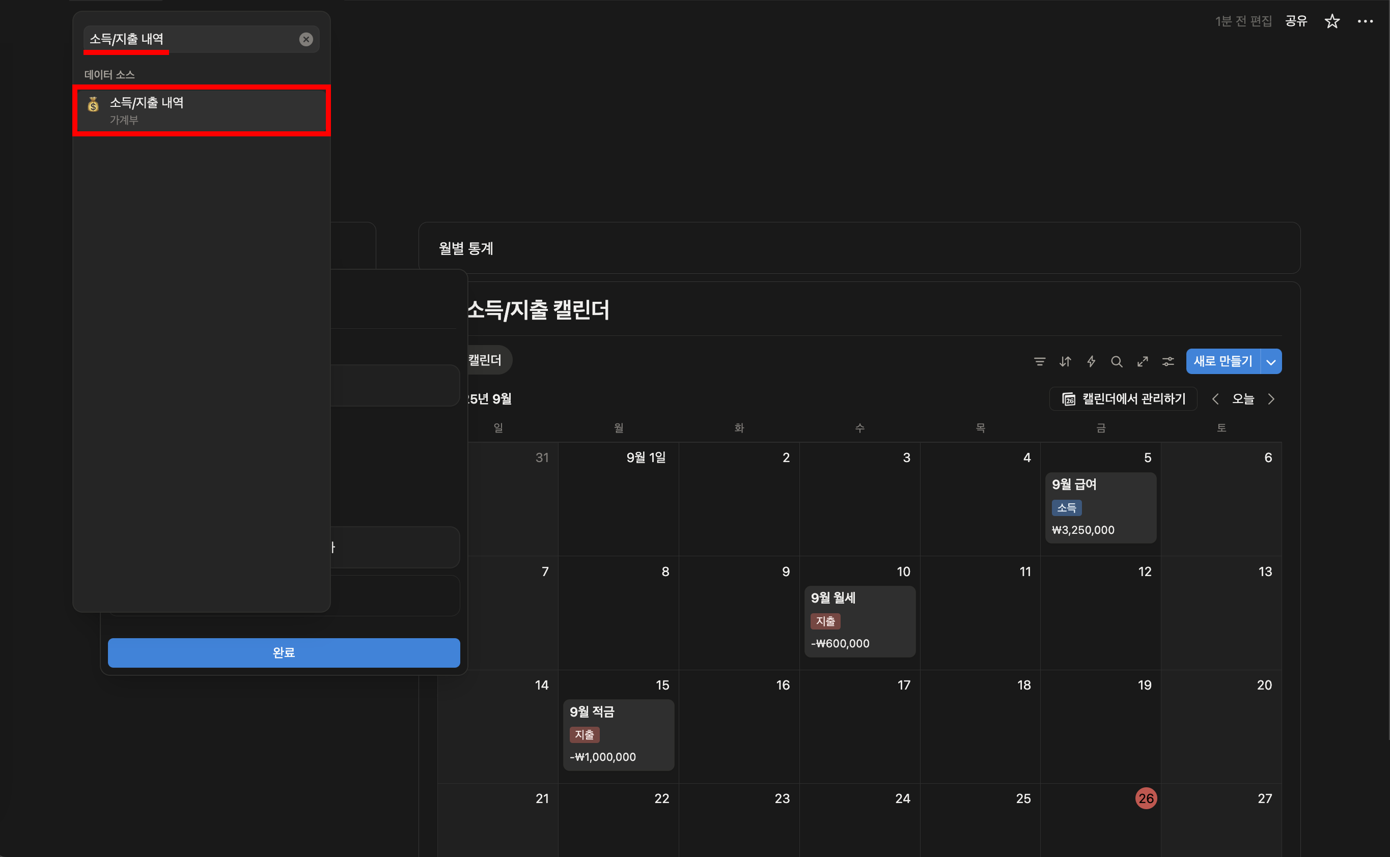 "์๋/์ง์ถ ๋ด์ญ" ๋ฐ์ดํฐ๋ฒ ์ด์ค ํ์ด์ง๋ฅผ ์ง์ ํ๋ค.