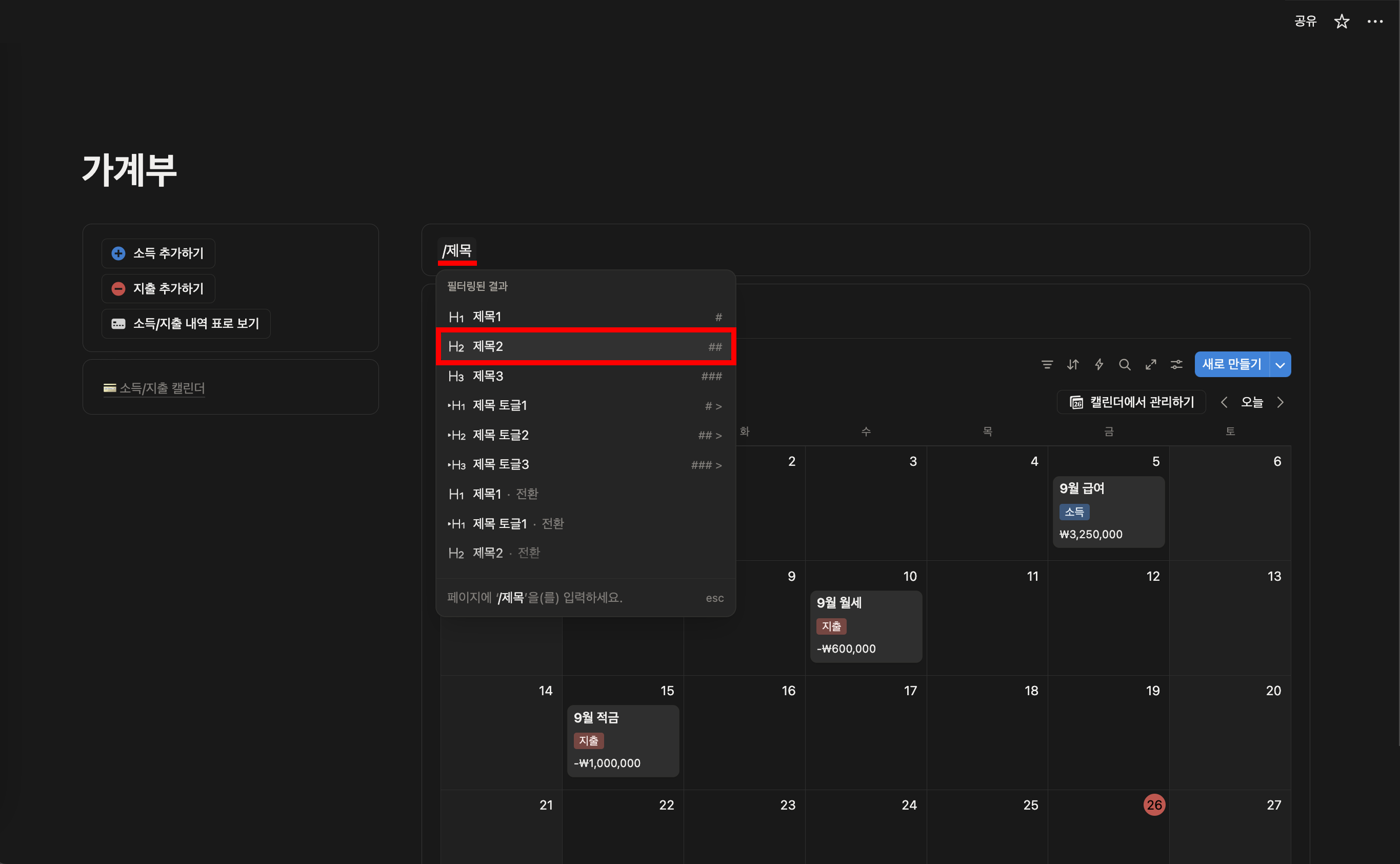 "/์ ๋ชฉ2"๋ฅผ ์ ๋ ฅํ ํ "์ ๋ชฉ2" ๋ธ๋ก์ ์์ฑํ๋ค.