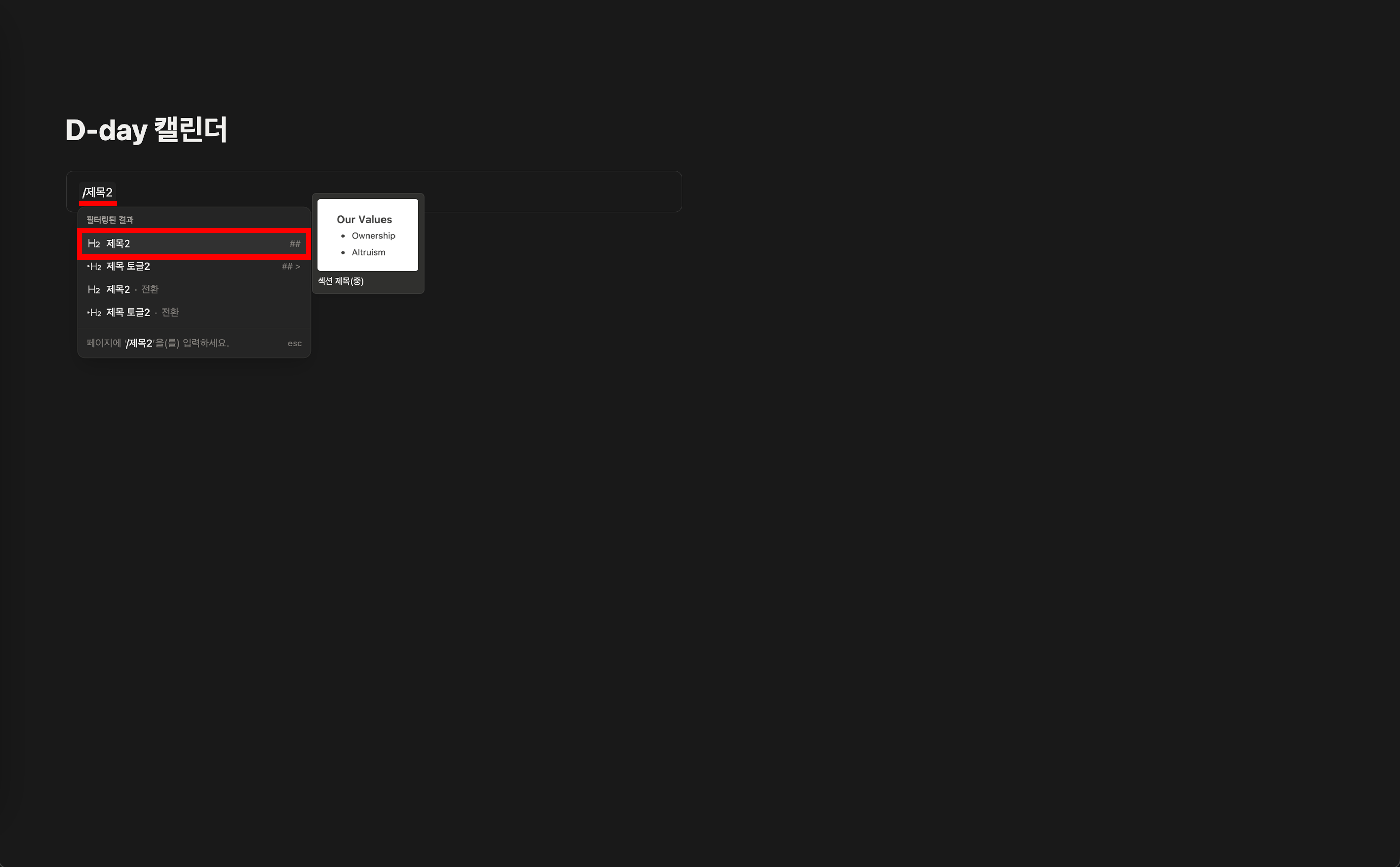 ์ฝ์์ ๋ธ๋ก ๋ด๋ถ์์ "/์ ๋ชฉ2" ์ ๋ ฅ ํ "์ ๋ชฉ2" ์ต์ ์ ์ ํ,
